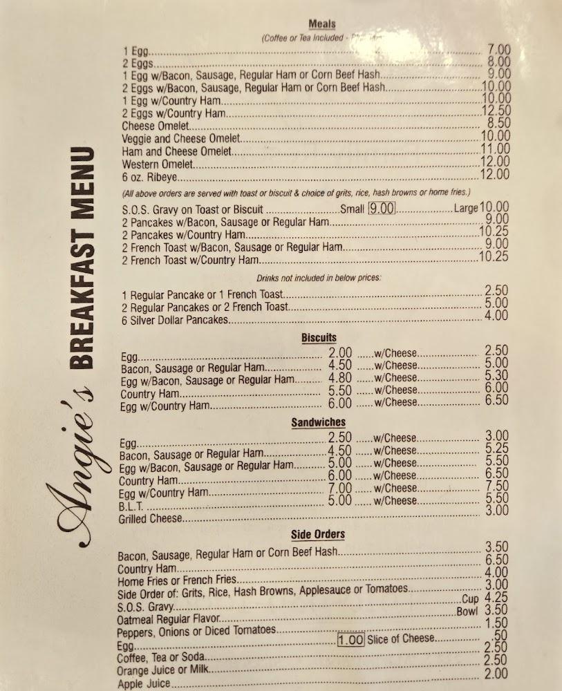 Angie's menu focuses on traditional breakfast fare. Highlighted items include eggs prepared in various styles, savory sandwiches, and sides like grits and home fries. Prices remain affordable, typically ranging from $5 to $20.