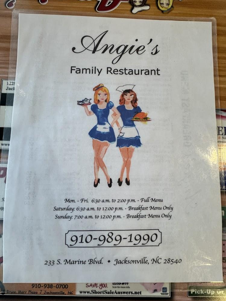 Welcome to Angie's, a cozy restaurant located at 233 S Marine Blvd in Jacksonville, NC, where breakfast dreams come true! Specializing in delightful breakfast options and traditional cuisine, we invite you to savor our excellent coffee and a wide selection of teas. Enjoy a relaxed atmosphere, perfect for solo diners and groups alike. With amenities like takeout, dine-in, and delivery, we cater to your needs. Accessible seating and facilities ensure everyone feels at home. Join us for brunch or lunch, and don’t forget to try our local specialties. Perfect for families, we also offer a kids' menu!